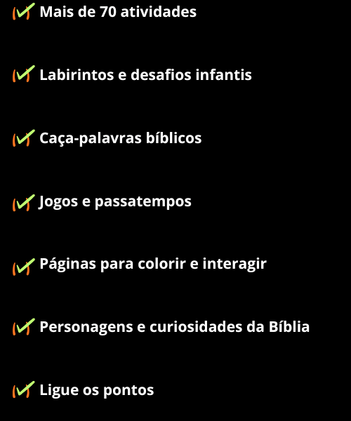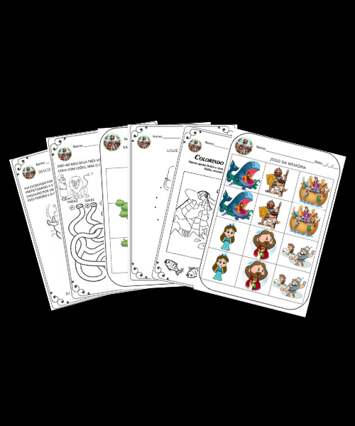 Páginas com propostas que ajudam a criança a aprender sobre personagens, histórias e ensinamentos da Bíblia de forma prática.